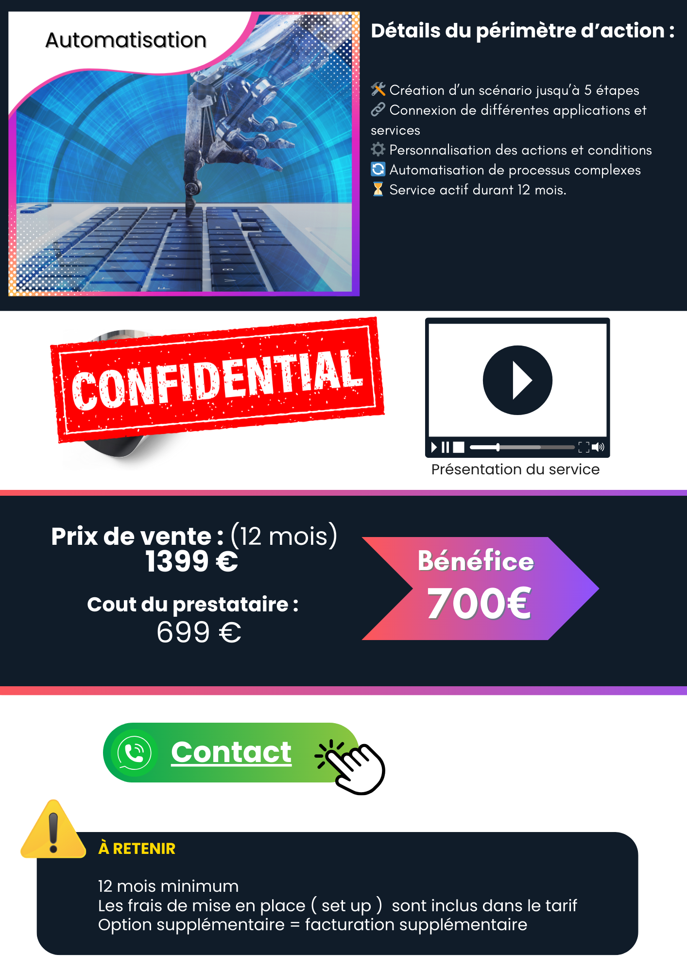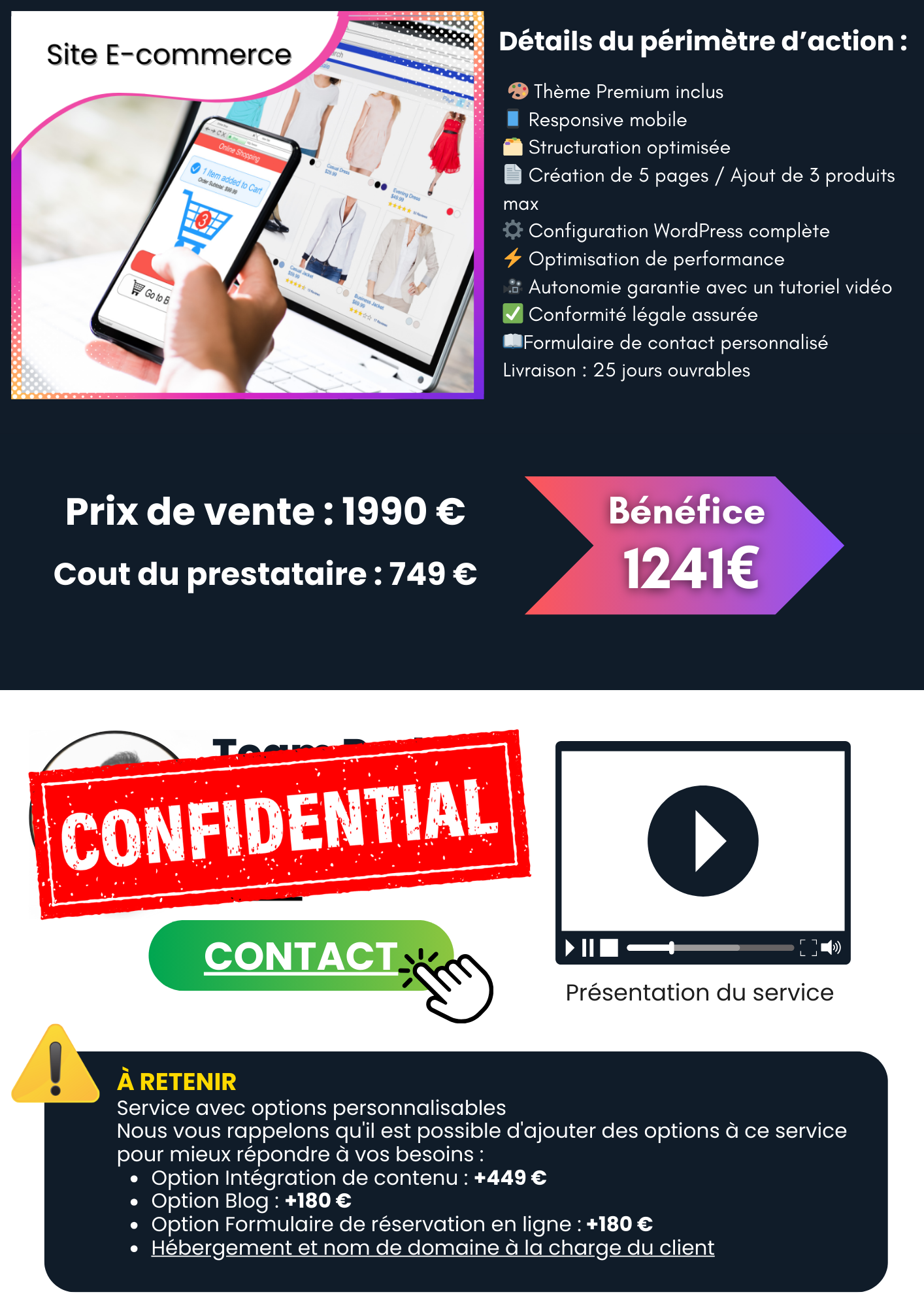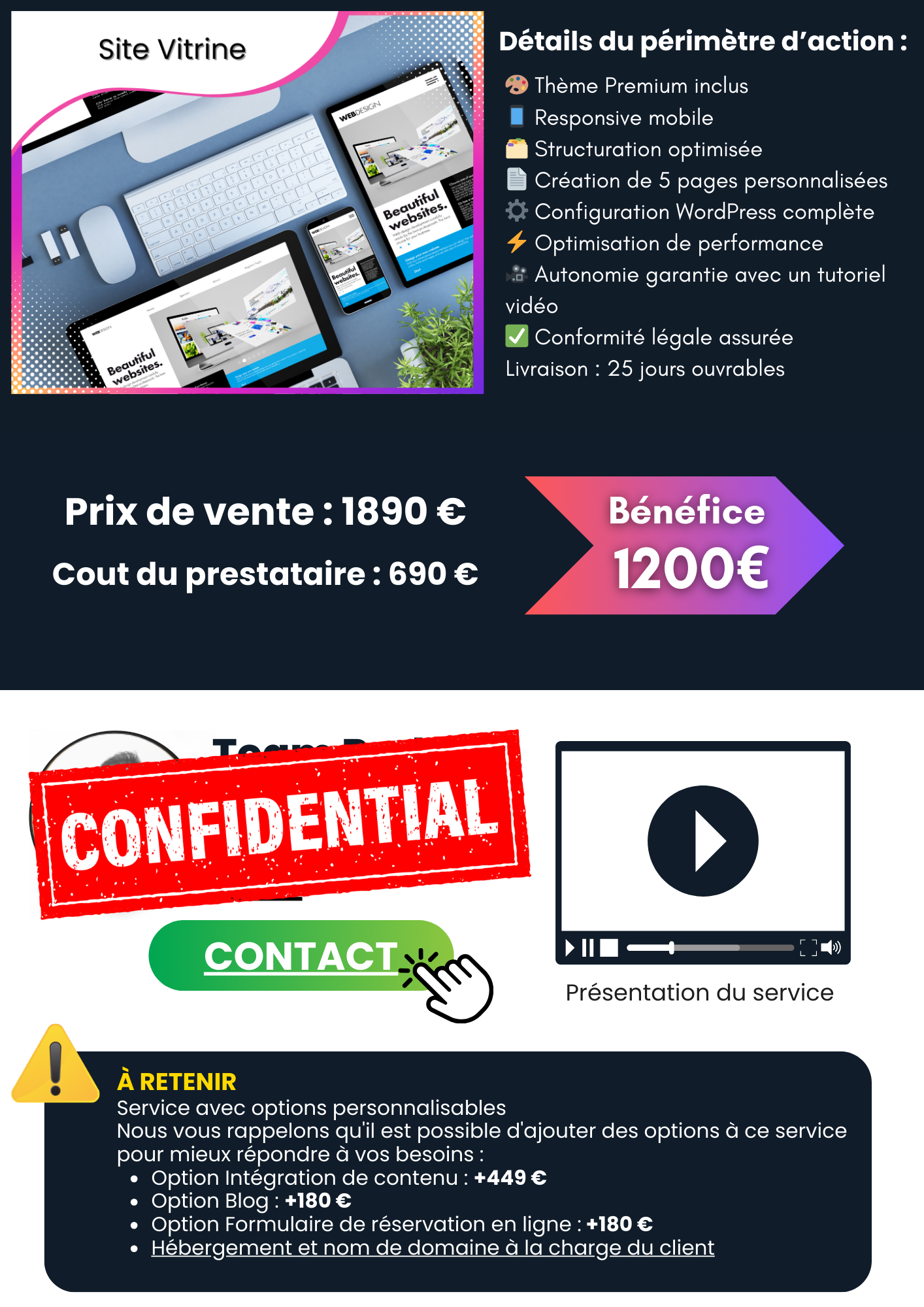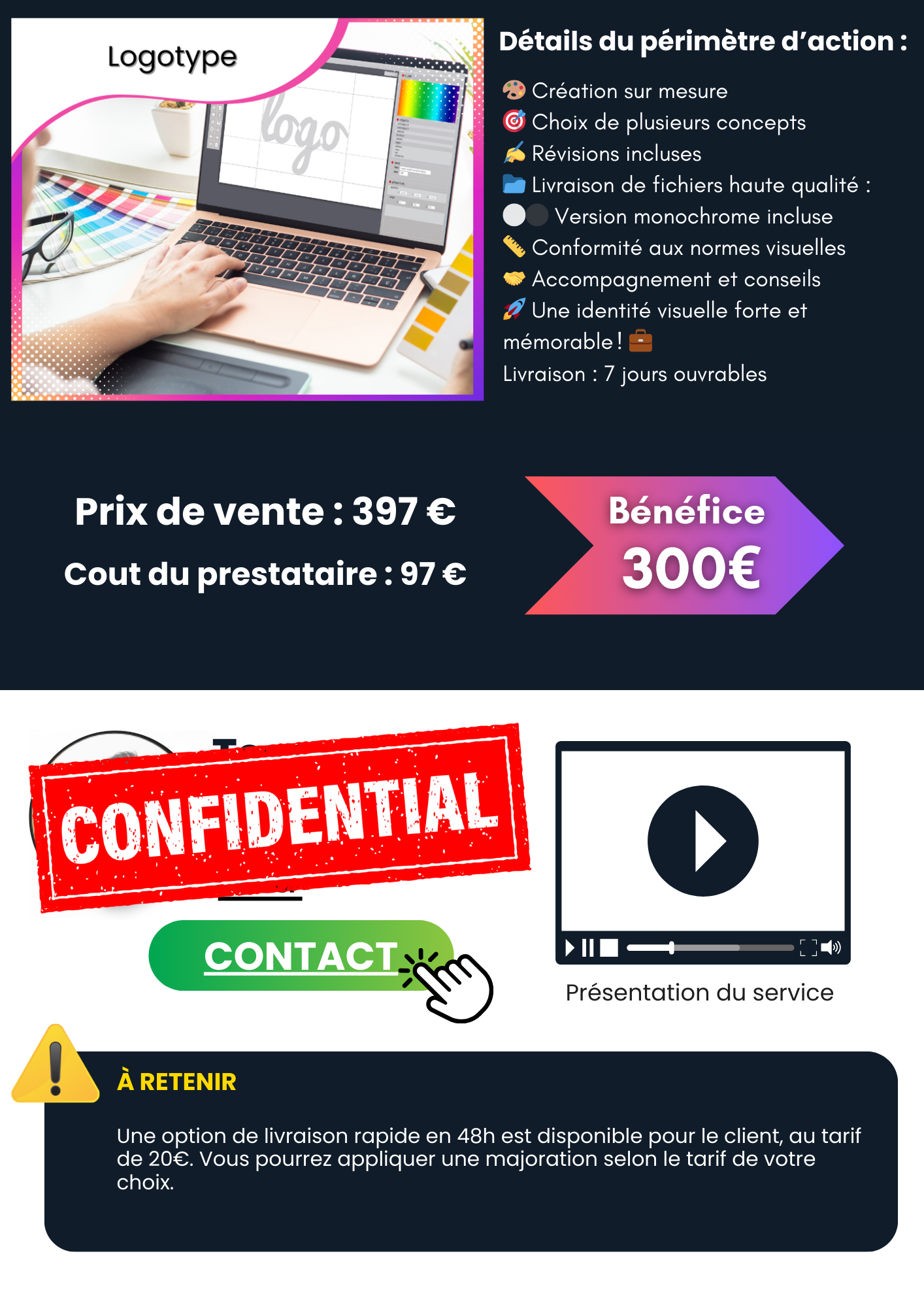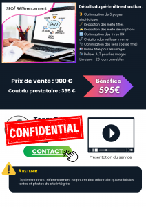 - Des tarifs compétitifs : Profitez de tarifs hors concurrence, vous permettant de réaliser des marges exceptionnelles, jusqu’à plus de 1000€ sur la vente de certains services.